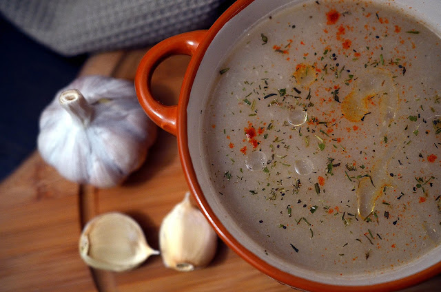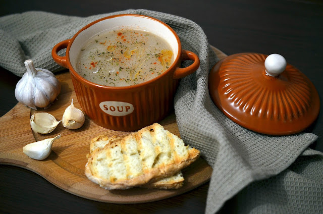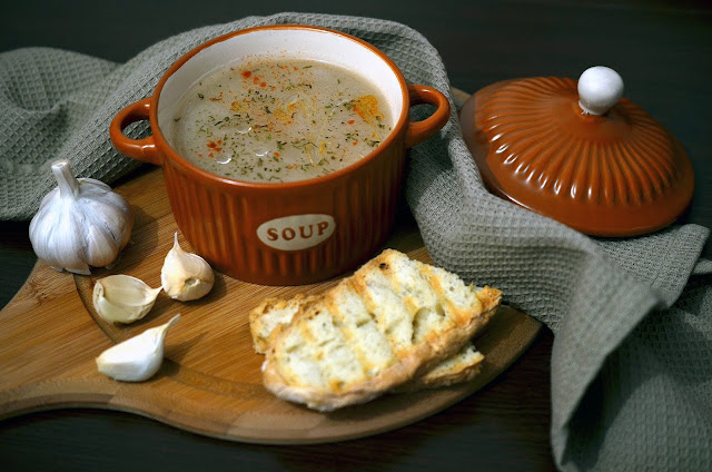 6-Supa crema de usturoi se serveste cu crutoane de paine, boia afumata, un strop de ulei de masline si cimbru uscat presarat deasupra.