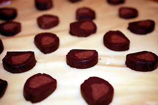 13-Din sulul maro se taie felii care se aseaza peste aluatul alb.