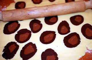 10-Aluatul maro deschis se ruleaza sub forma de sul;acesta se va infasura in aluatul maro inchis.