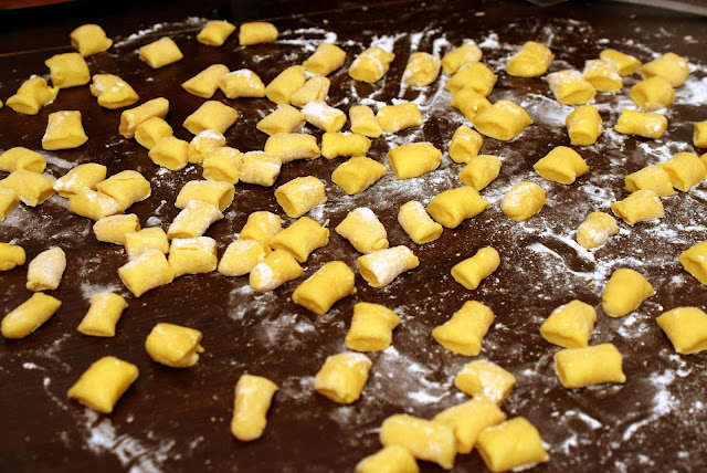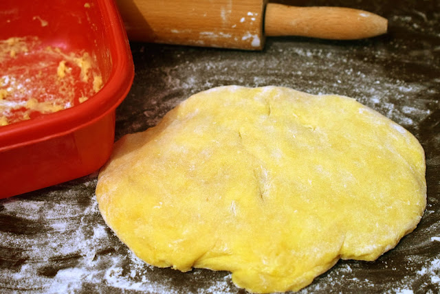 3-Se scoate aluatul din frigider, se pune pe blatul infainat si se modeleaza fasii de grosimea unui deget (vezi foto).
