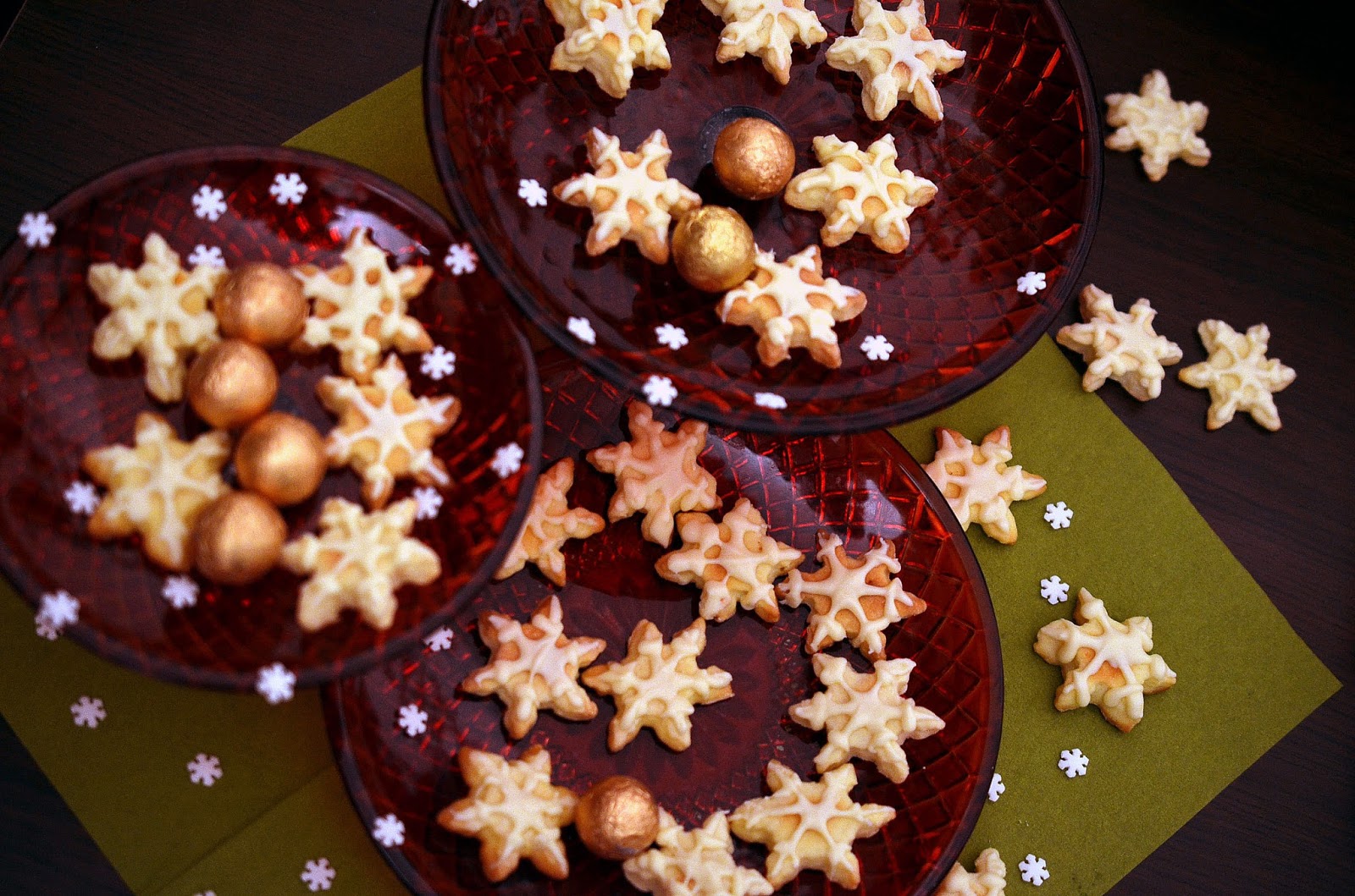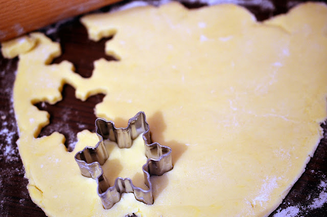 4-Pe blatul infainat se intinde aluatul in foaie nu prea subtire si se decupeaza fulgii (dati forma prin faina din cand in cand). Atentie! Aluatul se inmoaie rapid, recomand sa il prelucrati pe rand: intindeti o bucata, restul lasati la frigider si tot asa.