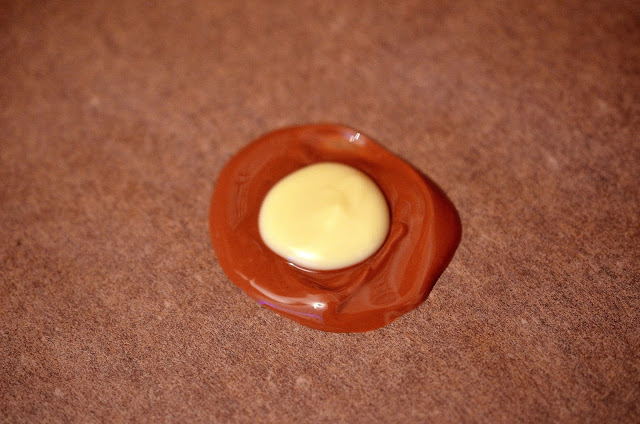 2-Pe o tava se pune o foaie de copt, iar pe aceasta se pune o lingurita de ciocolata cu lapte, in forma de bulina, sau cum vreti…,apoi in centrul bulinei, un alt rotund mai mic de ciocolata alba si, in final, inca un strop de ciocolata cu lapte in centrul bulinei albe (vezi foto).