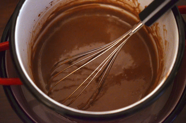 3-Laptele se pune intr-o cratita si se amesteca cu cafeaua instant, cacaua, esenta de vanilie, amidonul, zaharul si sarea. Acest amestec se pune pe foc mic, amestecand continuu cu telul, pana se ingroasa.