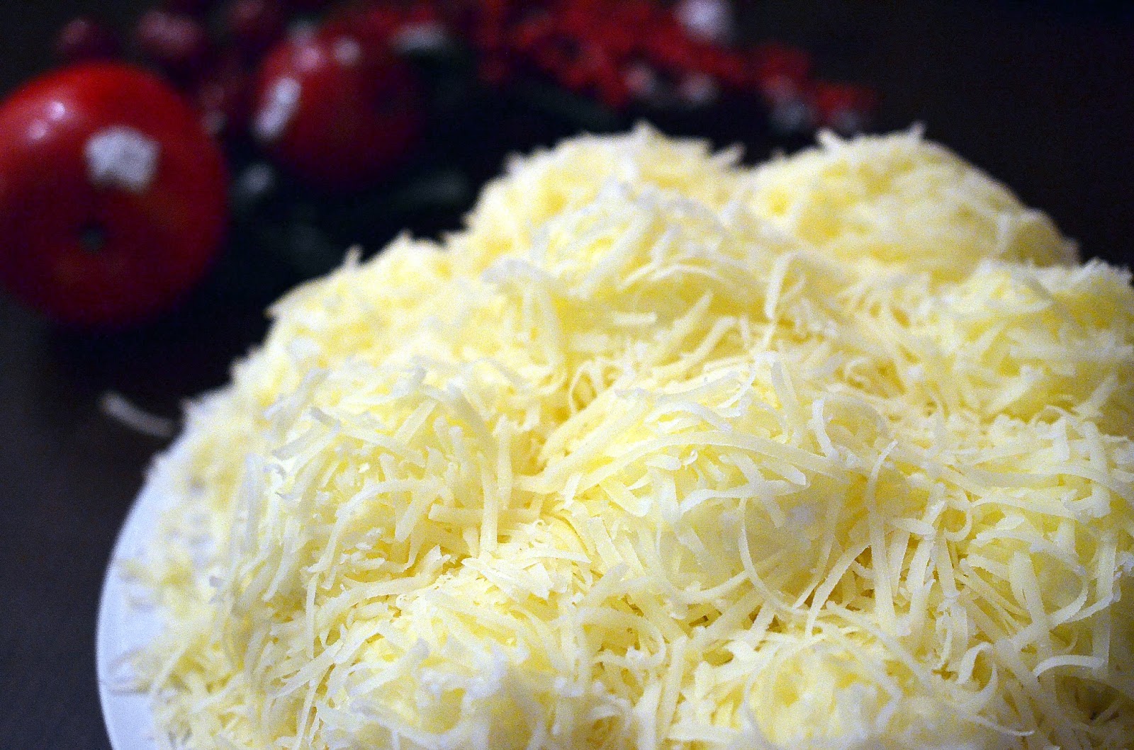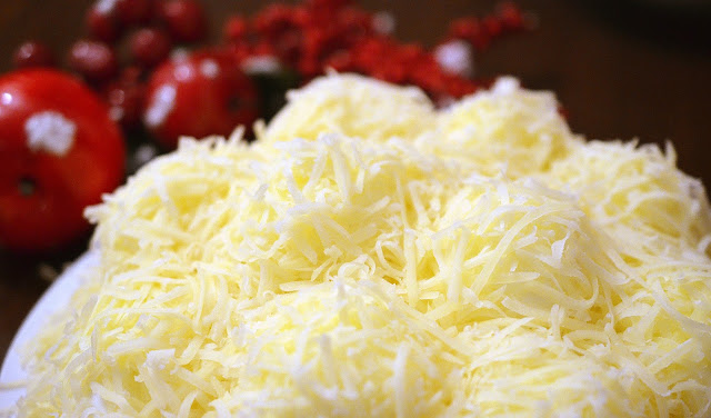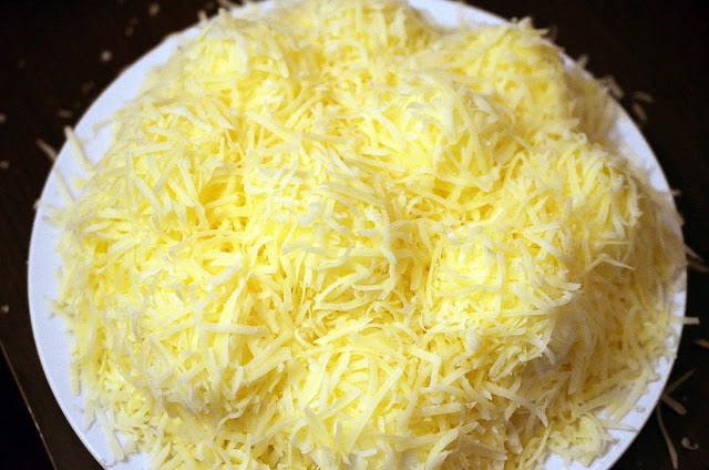 8-Se acopera toata salata cu cascaval ras (prin ochiurile mici ale razatorii).