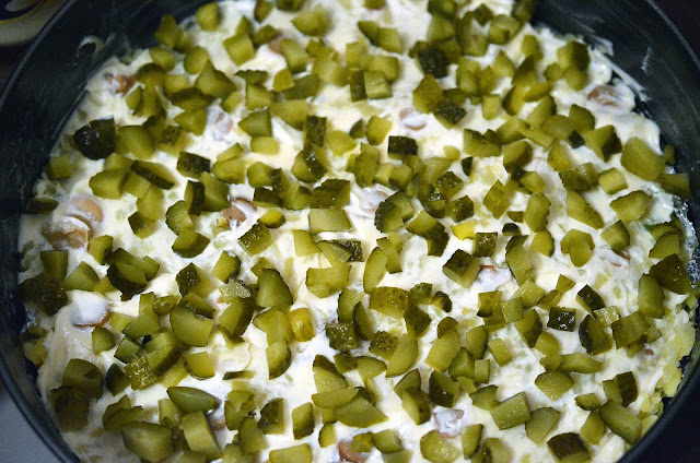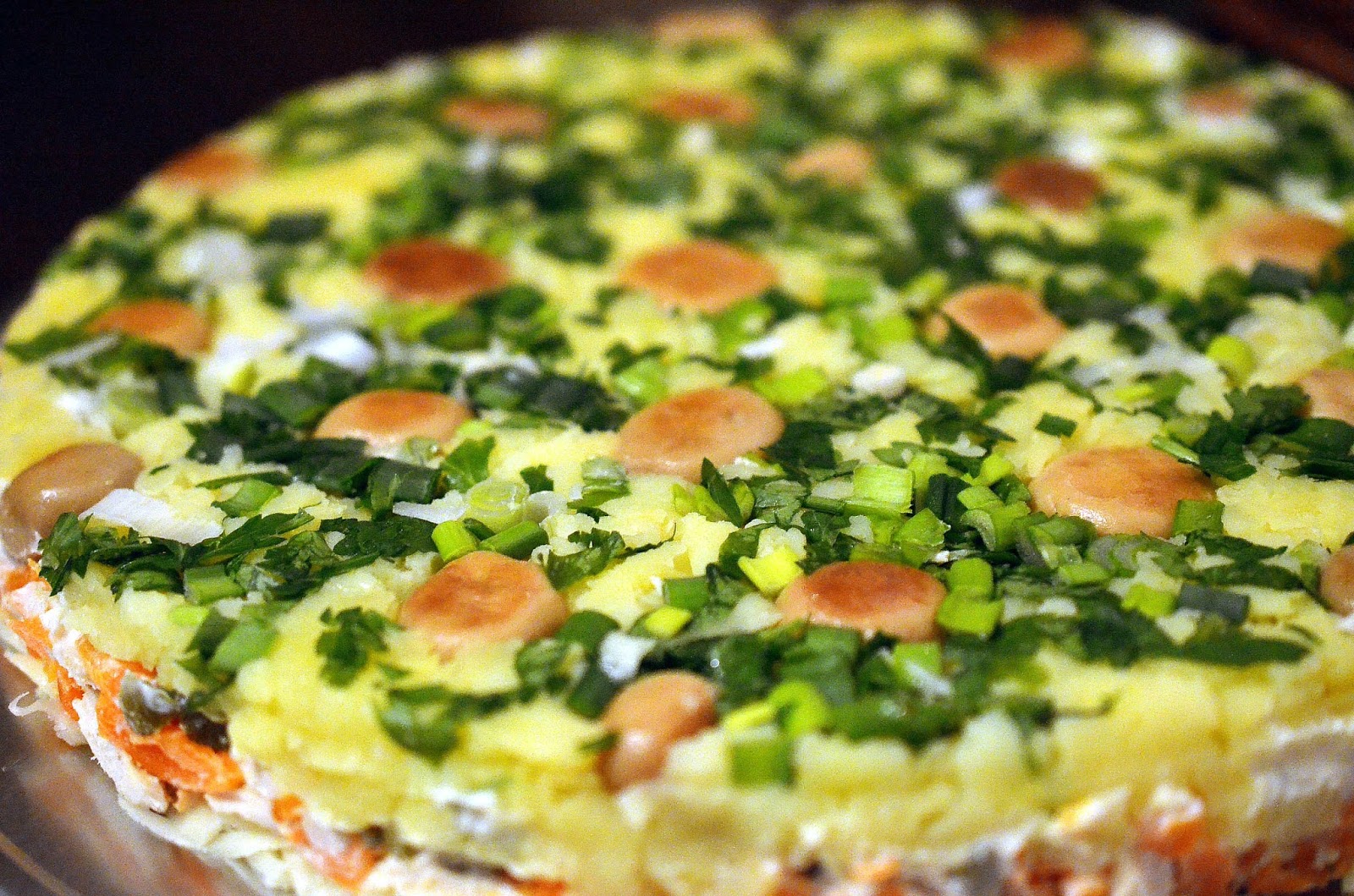 Eu spun ca aceasta salata este de pus pe masa atunci cand vin musafiri. Ingrediente simple, nimic complicat, cantitatile pot fi modificate, iar in functie de acestea se modifica si aspectul final. Eu am „asamblat”salata intr-o forma detasabila de tort, cu diametrul de 24 cm, dar daca folositi o forma mai mica, sau o cantitate mai mare pentru straturi, salata va semana si mai bine cu un tort.