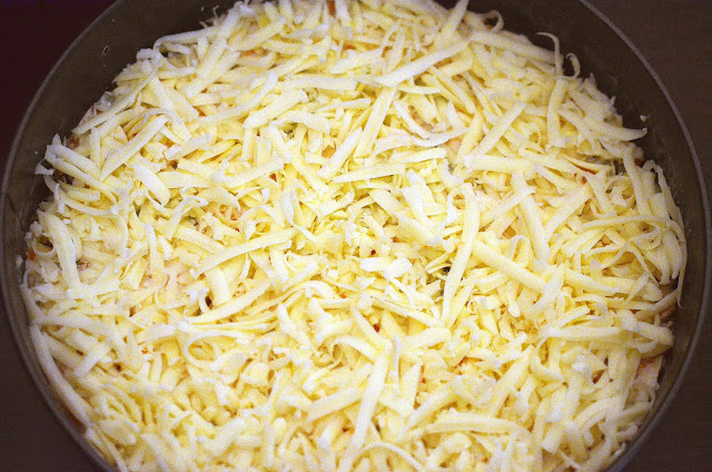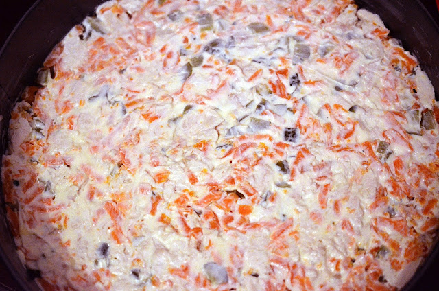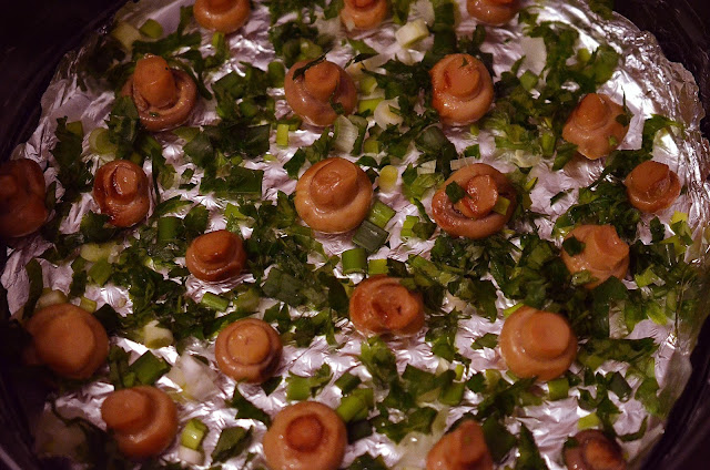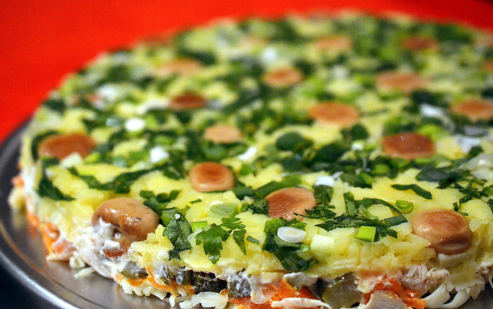 6-Intr-o tava (tapetata cu folie de plastic sau de aluminiu) se aranjeaza straturile salatei, astfel: ciupercile (cu palaria in jos, vezi foto), ceapa verde si patrunjelul, stratul de cartofi razuiti (mai condimentati, daca este cazul); presati cu furculita! Urmeaza maioneza (3 linguri), catravetii, morcovii razuiti (de asemenea, condimentati, daca este cazul), carnea maruntita, inca trei linguri de maioneza si, la sfarsit, stratul de cascaval razuit.
