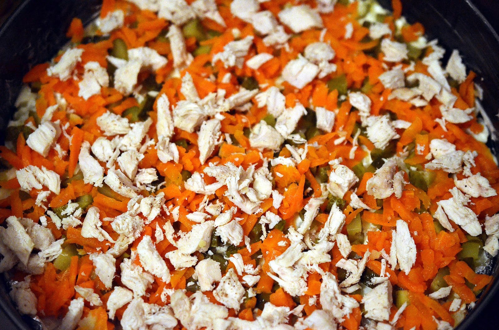 1-Cartofii, morcovii si pieptul de pui se pun la fiert in apa cu sare (dupa ce fierb acestea, lichidul se poate transforma intr-o delicioasa supa cu galuste, de exemplu).