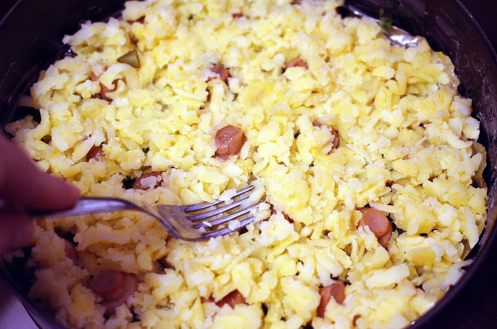 4-Cartofii, morcovii si cascavalul se dau prin razatoarea cu ochiuri mari.