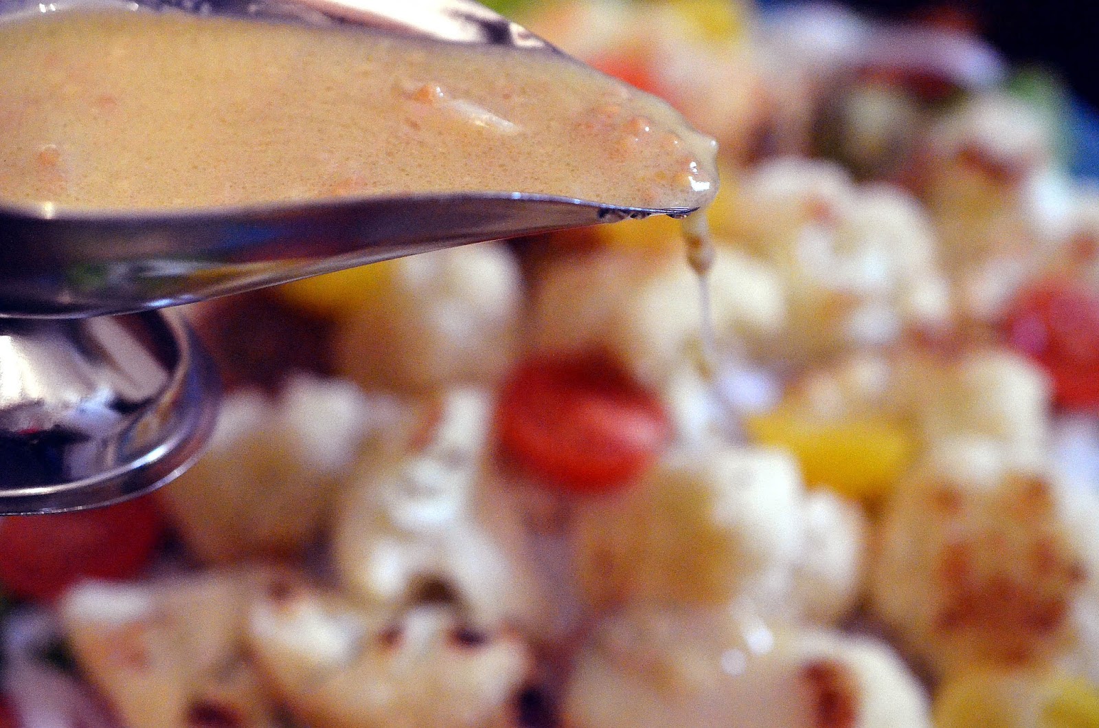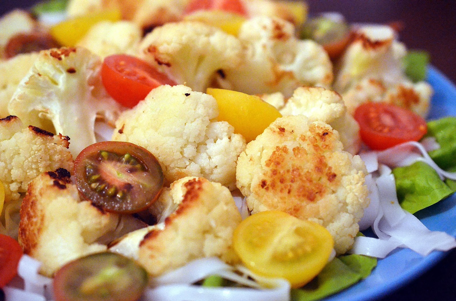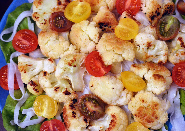 5-Se monteaza platoul: salata verde, taiteii de orez, conopida, jumatati de rosii cherry. Se serveste cu sosul pregatit.