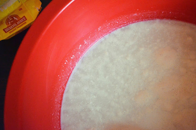 1-Intr-un bol incapator se pun apa calduta, laptele de cocos caldut, zaharul si drojdia proaspata faramitata. Se amesteca si se lasa 15 minute.