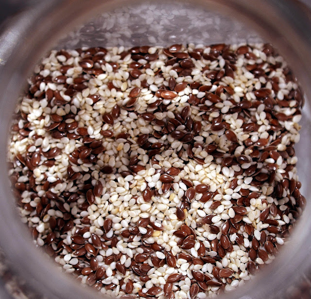 Amestec seminte de in + susan- 3 linguri (susanul este optional, dar semintele de in au rol de inlocuitor al oului, raman obligatoriu in reteta!)