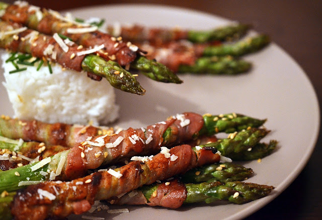 2-Fiecare tulpina de sparanghel se infasoara cu cate o felie de bacon, incepand de sus.