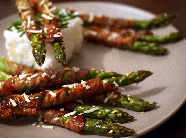 8-Se aranjeaza preparatul: orezul, sparanghelul cu bacon; se presara parmezan, susan si cepsoara. Se tempereaza totul cu putin iaurt.