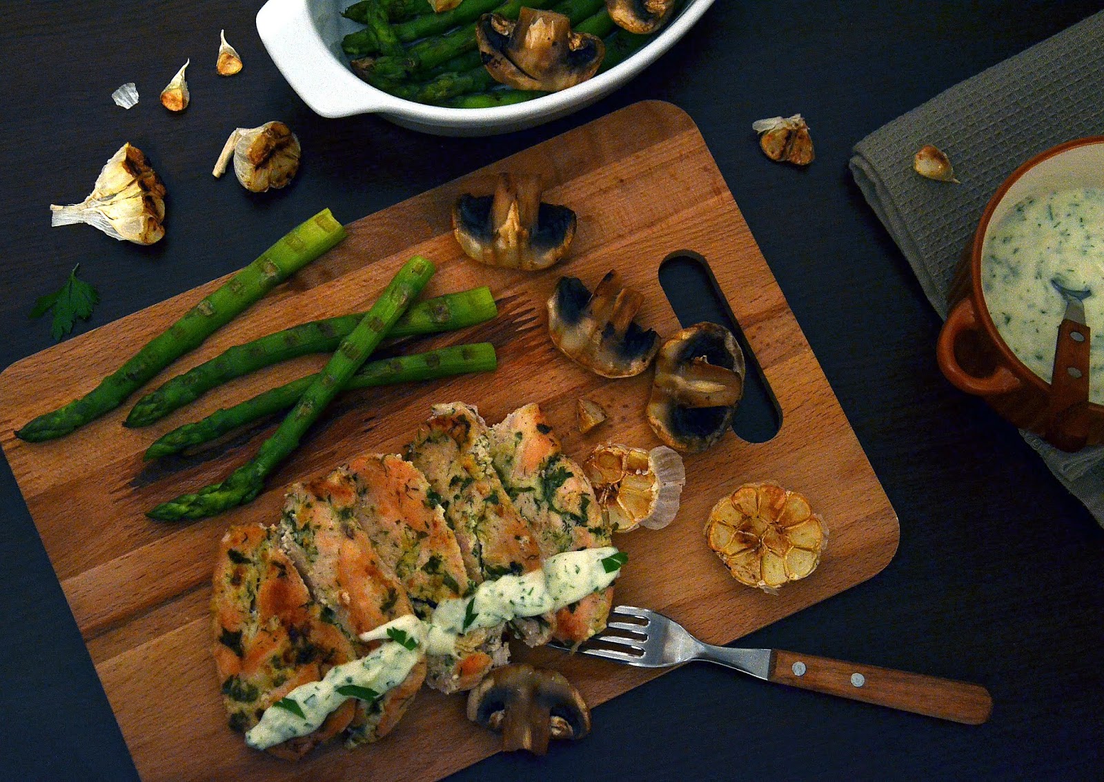 4-Cat timp carnea este la cuptor, se pregatesc legumele: ciupercile se curata si se taie in jumatati, capatanile de usturoi se taie in jumatati pe latime, la sparanghel se inlatura partea inferioara, mai tare, indoind tulpina.